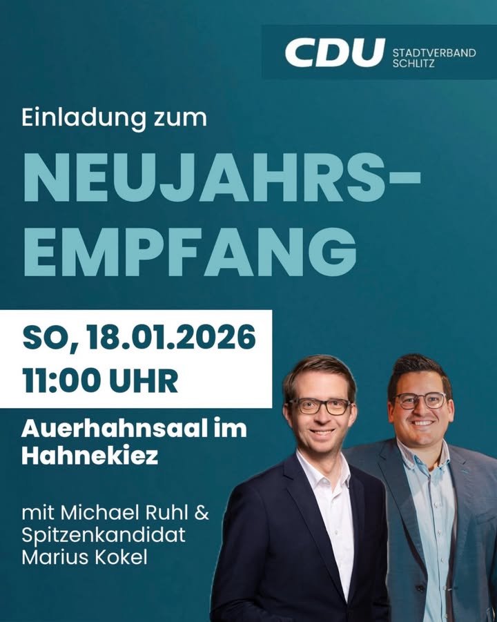 Neujahrsempfang 2026 der CDU Schlitz ✨Das politische Jahr 2026 startet ? und wir laden herzlich ein!📅 Sonntag, 18. Januar 2026⏰ 11:00 Uhr📍 Auerhahnsaal im HahnekiezGemeinsam mit unseren Gästen Michael Ruhl, unserem Spitzenkandidaten Marius Kokel sowie Bürgermeister Heiko Siemon möchten wir mit den Bürgerinnen und Bürgern ins Gespräch kommen und über die Zukunft von Schlitz und Schlitzerland diskutieren.Der Neujahrsempfang ist zugleich der Startschuss in die heiße Phase des Kommunalwahlkampfs ? vorbeikommen, Ideen einbringen und mit diskutieren! ?🏼?🏽👉🏼 Alle Interessierten sind herzlich eingeladen.CDUSCHLITZ SCHLITZERLANDNEUJAHRSEMPFANG