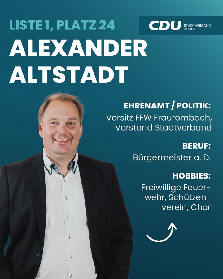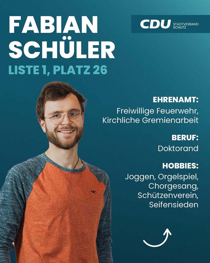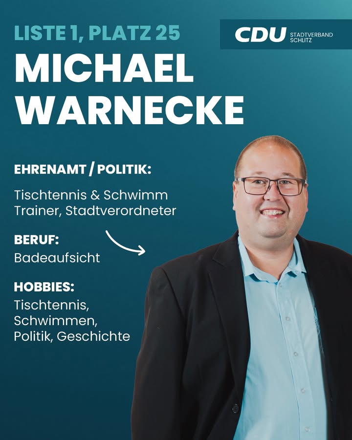 Unsere Vorstellungsrunde schreitet voran, es geht weiter mit Platz 25:➡️ MICHAEL WARNECKEMichael Warnecke, geboren am 21.12.1981, ist ein Schlitzer durch und durch. Nach seiner Ausbildung zur Fachkraft für Brief- und Frachtverkehr war er lange Zeit als Büroangestellter bei der Reha-Werkstatt Lauterbach tätig, wo er von 2009 bis 2019 als Werkstattratsvorsitzender wertvolle Erfahrung in der Interessenvertretung sammelte. Seit Sommer 2019 unterstützt er das Team im Schlitzer Freibad als Badeaufsicht ? eine Aufgabe, die er mit Blick auf die Wiedereröffnung im Sommer 2026 mit großer Vorfreude ausübt. 🛟🏊🏻Seit März 2025 bringt sich Michael Warnecke als Stadtverordneter aktiv in die Kommunalpolitik ein und möchte dieses Amt gerne fortführen. Für ihn ist die CDU der verlässliche Partner, der alle gesellschaftlichen Gruppen repräsentiert und Themen wie das Ehrenamt, die Vereinsförderung und den Brandschutz vorbildlich unterstützt. 🙏🏻Besonders am Herzen liegt ihm die Förderung der jüngsten Schlitzerländer. Er lobt ausdrücklich die bisherigen Maßnahmen im Kindergartenbereich und Jugendhaus und sieht einen Schwerpunkt der kommenden Jahre in der Bereitstellung neuer Kindergartenplätze sowie in Konzepten für ein lebenswertes Schlitzerland. "Unsere Stadt kann noch viel mehr", ist er überzeugt.Auch privat ist er ein Teamplayer: Seit seiner Kindheit ist Michael Warnecke leidenschaftlicher Tischtennisspieler 🏓 bei der TSG Schlitz und dort seit 20 Jahren als ehrenamtlicher Übungsleiter für die Jugend und Schüler im Einsatz.Michael Warnecke kandidiert erneut auf der Liste der Schlitzerländer CDU, um Gemeinsam eine starke, zukunftsgewandte Politik für seine Heimat zu machen. 🤝🏼CDUSCHLITZSCHLITZERLANDKOMMUNALWAHLKANDIDATENVORSTELLUNG